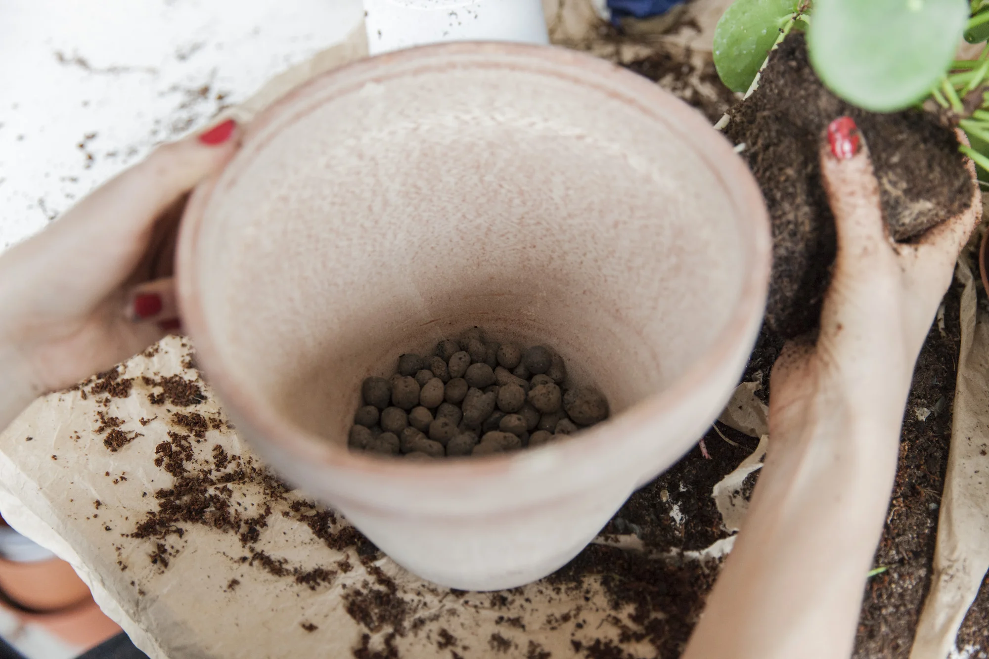 2) Legg et lag med Lecakuler i bunnen av potten for å sikre god drenering. slik at planten holder på fuktighet lengre uten å råtne fra bunnen.