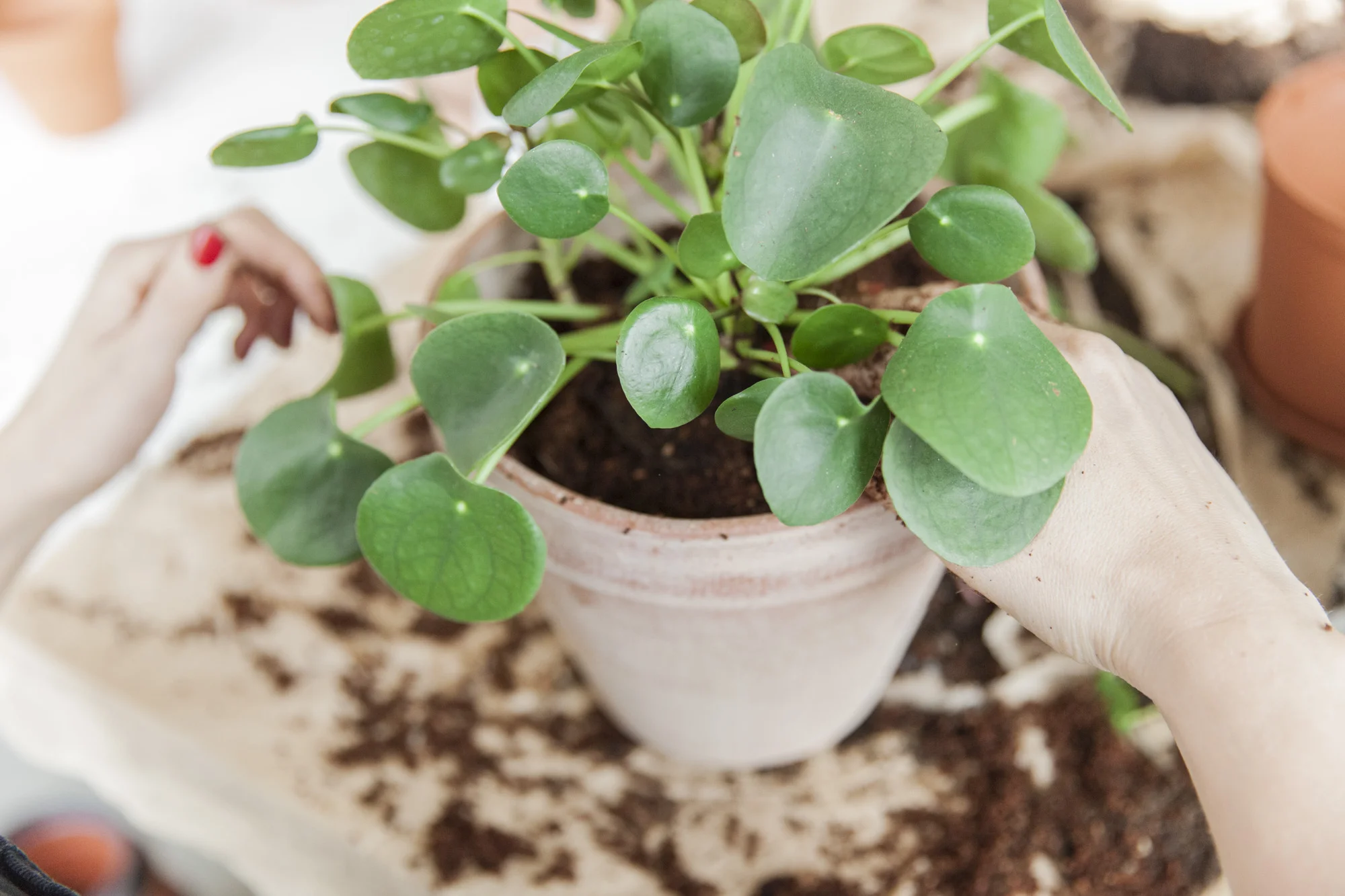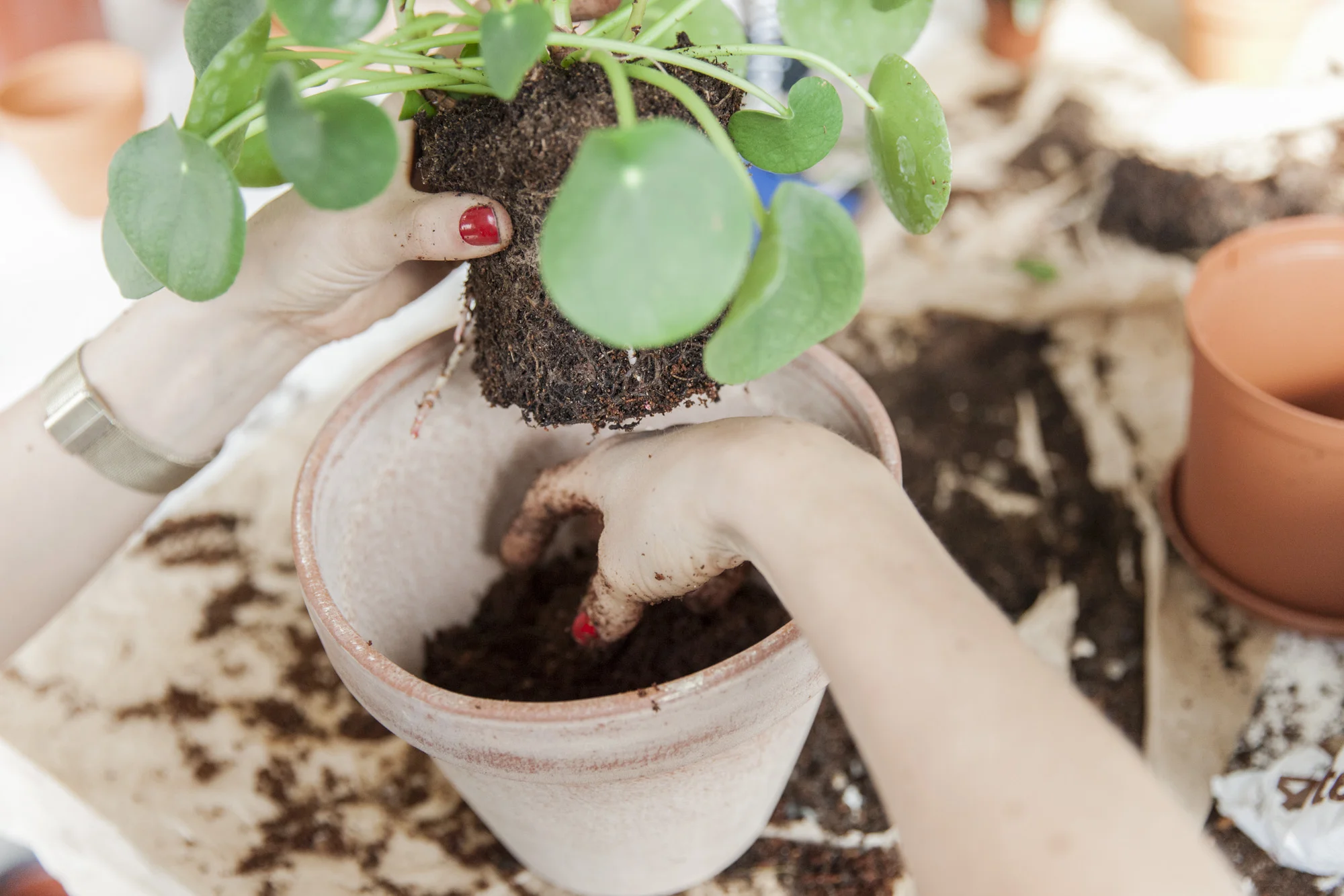 Planter vokser like mye under som over bakken, og må pottes om for at de skal kunne vokse enda mer. Det er greit å ta en sjekk og samle opp de som trenger å pottes om en gang på våren og en gang på høsten. Vinteren skal man helst ikke røre dem for mye. Hvis man ser at det stikker røtter ut av potten: pott om.