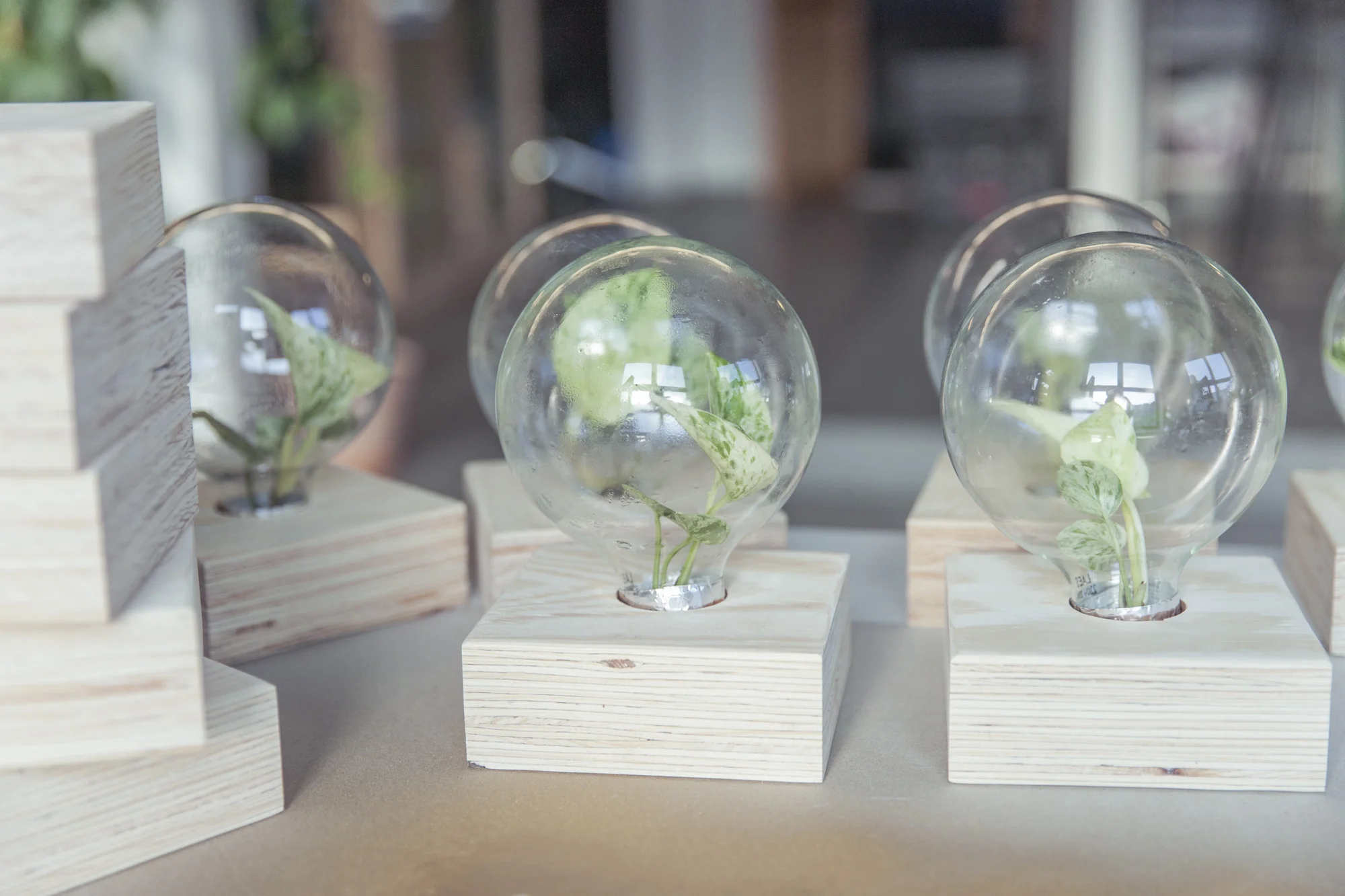 I mai gjorde vi et prosjekt for en kunde der de ville at vi skulle bygge små terrarier inni lyspærer på en sokkel. For en kjempeutfordring! Vanligvis er hullet i et terrarium i toppen, og kan forsegles etter at alt er satt pent og pyntelig oppi, mens her skulle alt være på plass før det ble satt inni lyspæren og montert på sokkelen.