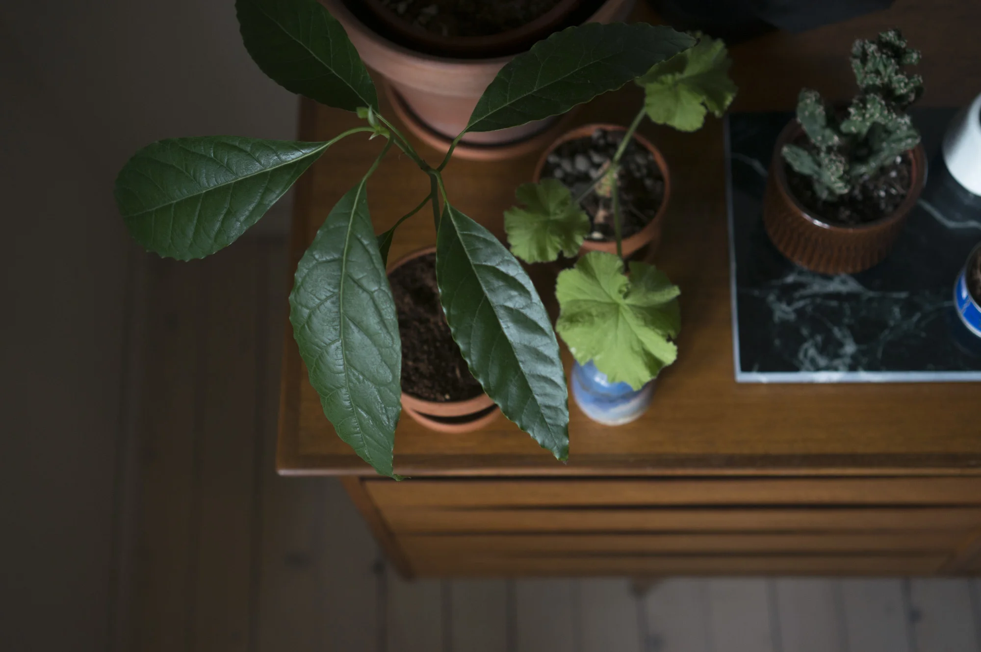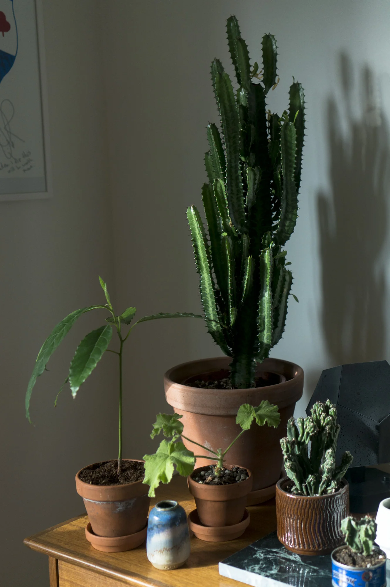 Avokadoplanten er akkurat plantet i jord, duftpelagonian fikk hun i bursdagspresang og de to andre ser ut som kaktuser, men så er de euphobiaer. Sjenken er kjøpt på loppemarked på Refstad Skole.