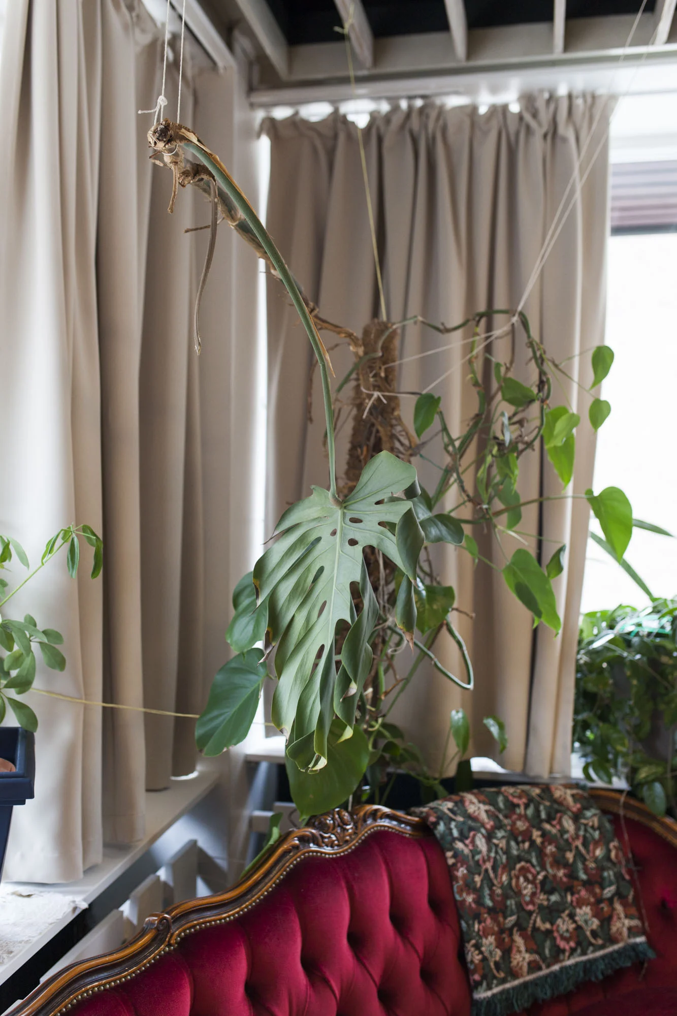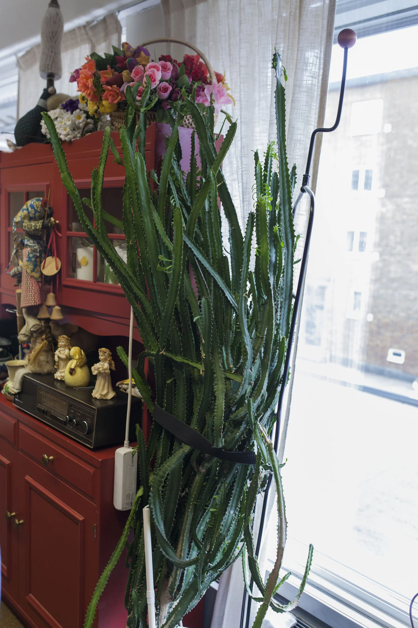 Anita: – Jeg har bare vært her i 8-9 år, men jeg tror det må vere kaktusen vi har hatt lengst (se bildet under). Den har nok bodd her i 15-16 år. Jeg husker den sto i en brun plastpotte før vi potta den om, og akkurat de pottene var veldig populære tidlig på 80-tallet. Og så er monsteraen og gullrankene veldig gamle da, de holder seg jo fine uten så mye jobb.