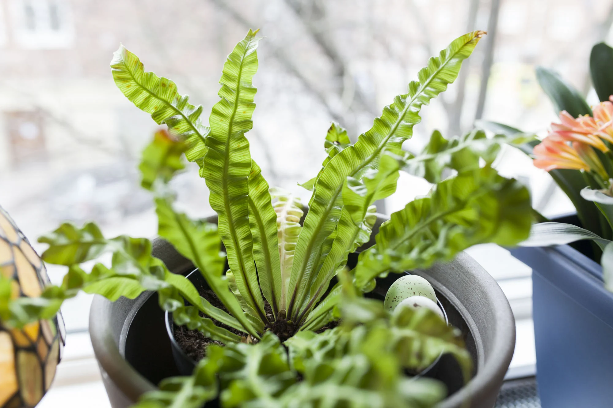 Laila: – Jeg har blitt veldig glad i den der borte! *Peker mot en stor palettblad*. Jeg og Anita planta alle småplantene vi hadde som sto litt her og litt der opp i én stor potte. Der putta vi bare oppi alt i håp om at de kom til å feste seg – til og med blader som knakk av mens vi holdt på – og det har de faktisk gjort! Man må bare passe på å knipe av blomsterne som kommer på lange stengler på palettblad, de suger all den fine fargen ut av bladene.